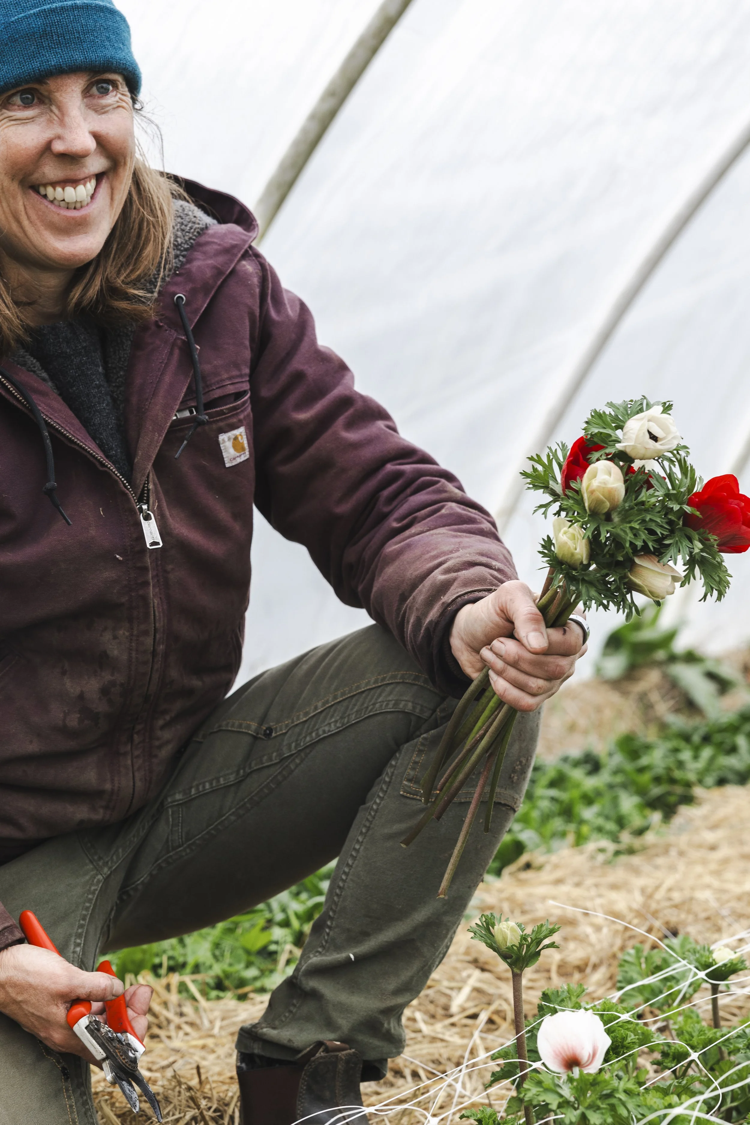 Our flowers are grown in the same way, and contribute additional ecological benefits. Most vegetable farms are out of balance in that few crops are left to flower, and although Singing Frogs is already a stellar pollinator-friendly farm with our flowering hedgerows, by growing rows of flowers, we provide even more support to pollinators and other beneficial insects providing food and habitat corridors throughout the farm.